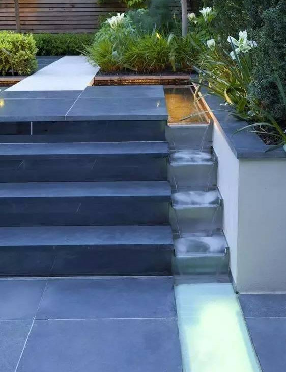 跌水是指規(guī)則形態(tài)的落水景觀,多與此同時建筑、景墻、擋土墻等結(jié)合,跌水表現(xiàn)了水的墜落之美。